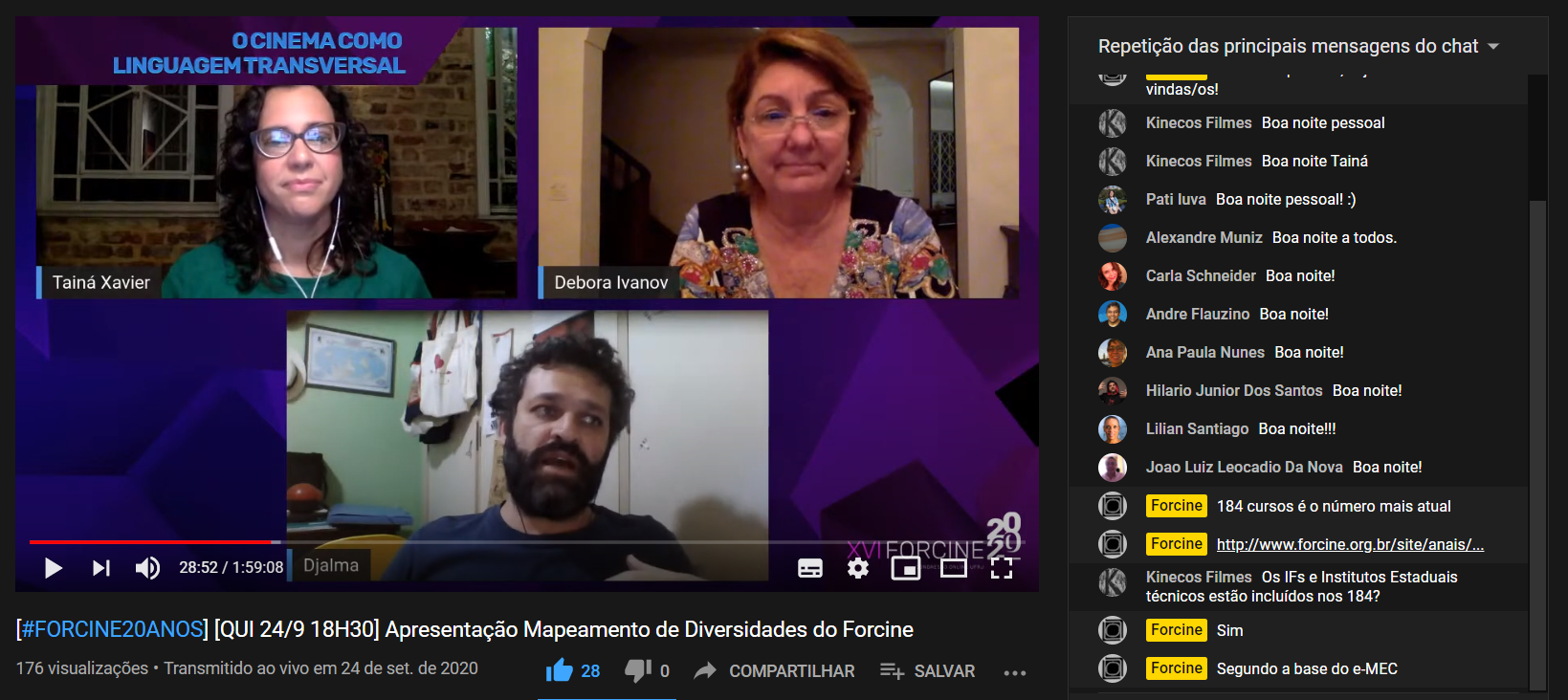 O Forcine e a Universidade Federal do Rio de Janeiro (UFRJ) organizaram, pela primeira vez na história da entidade, de 24 a 26/9, um Congresso totalmente online. A modalidade foi adotada por conta das restrições impostas pela pandemia COVID-19 e resultou em diversas novas conexões e reencontros de docentes, estudantes, técnicos, entidades parcerias e toda a comunidade do ensino de cinema e audiovisual brasileiro. Toda a programação foi transmitida ao vivo por meio do canal do Forcine no Youtube e permanece gravada para consultas e visualizações posteriores.
