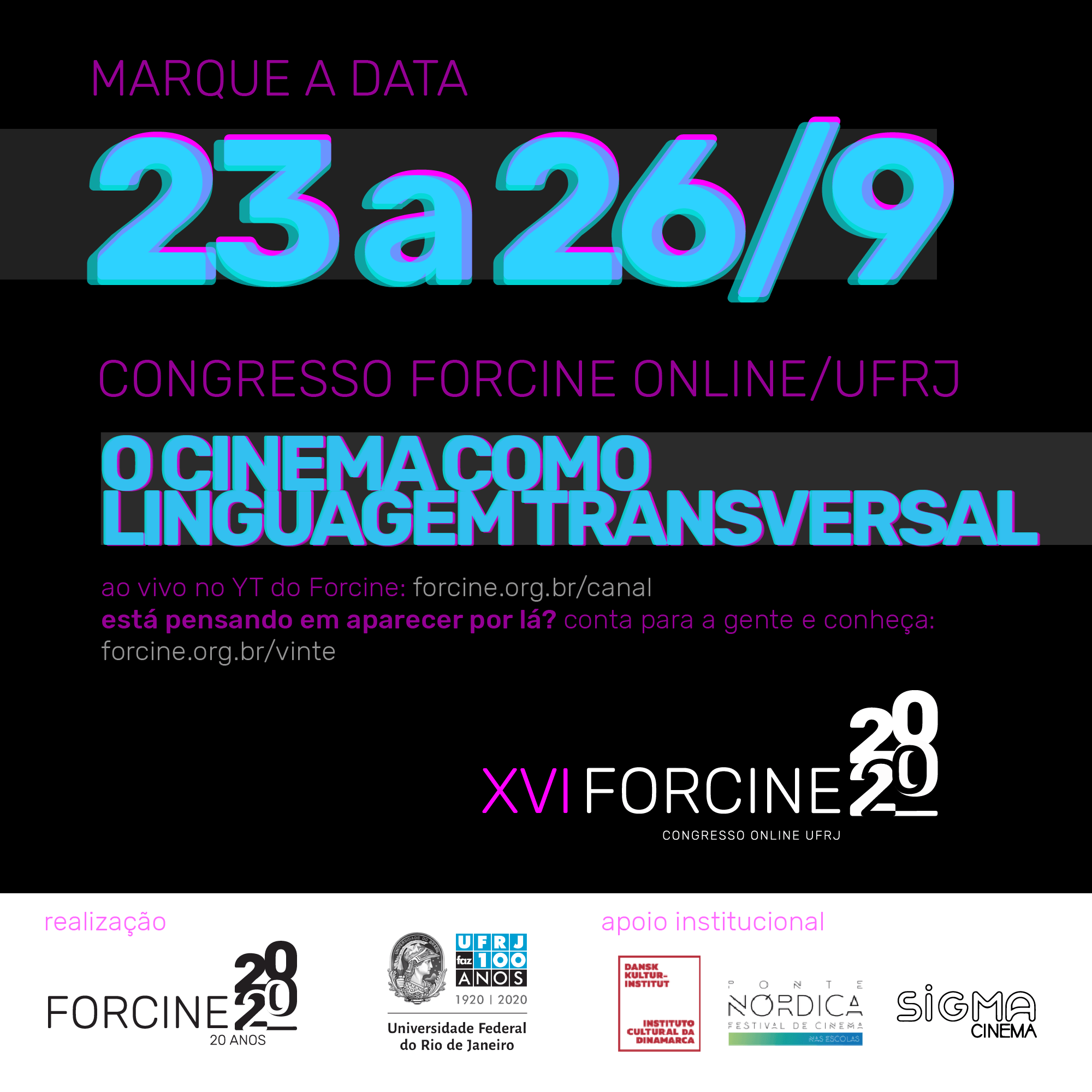 Os cursos de cinema e audiovisual no Brasil estão formando profissionais para um mercado múltiplo, convergente, que une Cinema, Rádio, Televisão, Games, Realidade Virtual, Mídia Arte e outros. Por isso, o termo Cinema não se resume ou se define mais por expressões como "a sétima arte" ou "a indústria dos sonhos". O Cinema é uma arte industrial que acumulou, ao longo do século XX, um corpus de obras, conceitos, dispositivos e documentos, capaz de se constituir como um método educacional transversal e de amplo espectro para o entendimento e a compreensão do mundo em geral e do mundo das artes, do entretenimento e da comunicação, em particular. No momento em que o Fórum Brasileiro de Ensino de Cinema e Audiovisual (Forcine) comemora 20 anos de atuação e que o curso de Radialismo da Escola de Comunicação da UFRJ repensa sua grade curricular para atualizá-la diante do cenário exposto, o XVI Congresso FORCINE na ECO-UFRJ, propõe um amplo debate sobre como o ensino e a prática do cinema se re-configuram, compondo um campo de estudos inovadores em artes e comunicação.